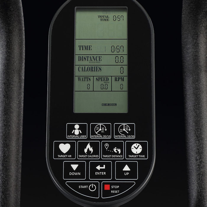 - Монохромный LCD-дисплей отображает общее время, время, расстояние, калории, ватты, скорость, об/мин, пульс. интервал.