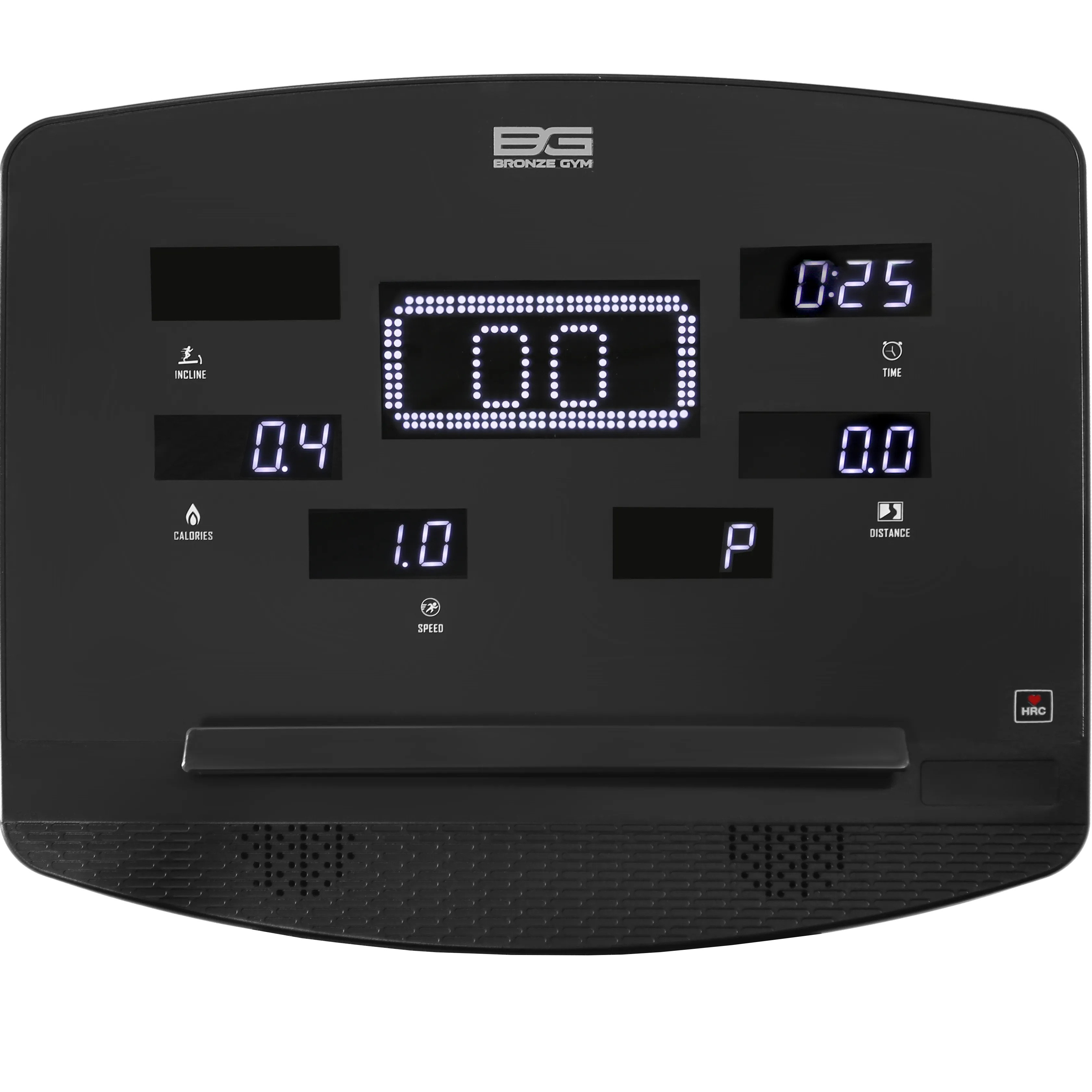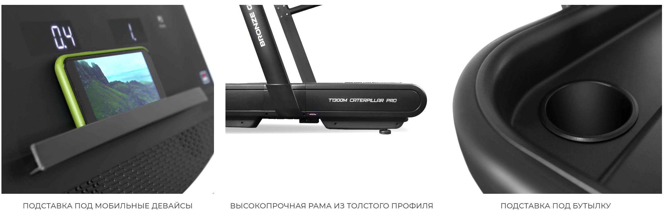 Отдельного внимания заслуживает беговое полотно модели. Bronze Gym T1300M CATERPILLAR PRO оснащен гусеничным полотном профессионального класса на алюминиевой основе с противоскользящим покрытием. Плюсом данного покрытия, несомненно, является простота в обслуживании, которая сводится к периодической очистке полотна и внутренней части. Более того, гусеничное полотно не требуется смазывать силиконом. Рабочая зона беговой поверхности широкая и составляет 160*55 см. Учитывая возможность спортивного тренажера работать в бесперебойном многочасовом режиме, полотно обладает высокой степенью износостойкости. Стоит отметить, что биомеханика T1300M позволяет заниматься на ней разным категориям пользователей. Высокая плавность хода достигается благодаря увеличенному размеру переднего и заднего вала. Не забыли инженеры позаботиться и о суставах тренирующихся. На беговой дорожке установлена система амортизации, которая представляет собой связь мультиабсорбирующих динамических элементов на основе гусеничной системы на высококачественных подшипниках. Сердцем электрического режима беговой дорожки является ее двигатель с заявленной мощностью в 4 л.с. (в режиме пиковых нагрузок 6 л.с.). Такой показатель мощности позволяет развивать скорость полотна до 22 км/ч. Для увеличения нагрузок можно воспользоваться электрически изменяемым углом наклона от 0 до 15%. Тренировочный компьютер оборудован профессиональным LED-дисплеем с точечной матрицей. Основной экран дополняют 6 небольших буквенно-цифровых LED-дисплеев. На мониторах отображаются следующие данные: программный профиль, время, скорость, дистанция, калории, пульс, угол наклона, уровень вибрации. Все клавиши и дисплеи оснащены белой подсветкой. В число программ входит 4 вида тренировок. В механическом режиме предусмотрено 36 уровней регулировки сопротивления. Есть здесь и режим вибрации (релакса) с 10 уровнями изменения показателей. В комплекте с беговой дорожкой идет и нагрудный кардиодатчик, который синхронизируется с встроенным приемником, работающим по протоколу Bluetooth Smart 4.0. Приятной опцией является подставка под телефон или планшет, а также держатель для бутылочки с водой и место для личных вещей.