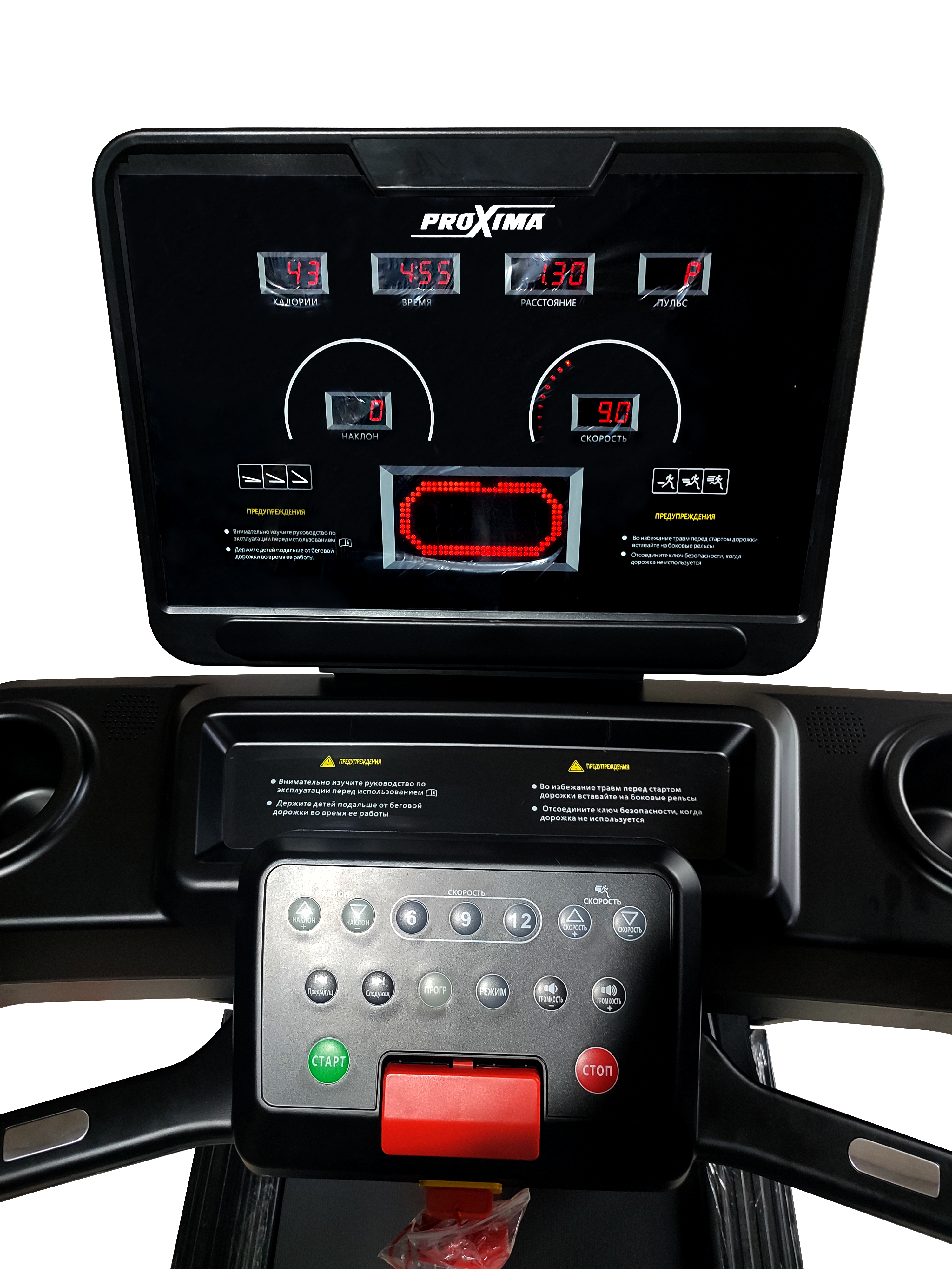 В консоль интегрирован удобный и информативный светодиодный LED дисплей коммерческого уровня, отображающий все основные параметры тренировки: скорость, темп, дистанцию, частоту сердечных сокращений, количество израсходованных калорий и другую полезную информацию.