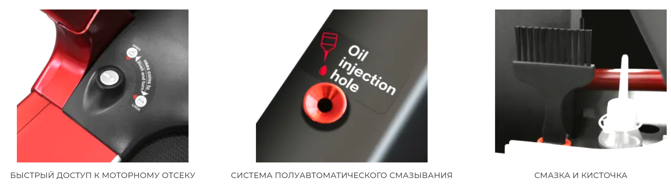 - Кожух моторного отсека закрепили двумя клипсами, их можно открыть монетой за пару секунд. Теперь Вам легко получить доступ к моторному отсеку, чтобы проводить очистку. В данной модели предусмотрена ниша для кисточки (помогает проводить очистку) и масленка с силиконом (для смазки полотна, добавляется в систему автоматического смазывания).