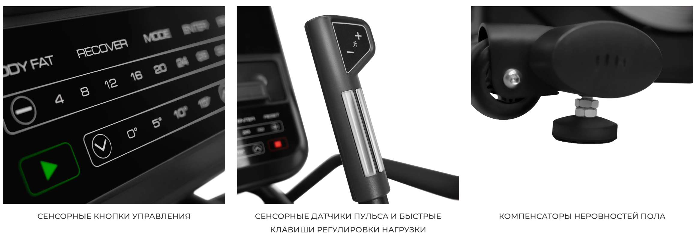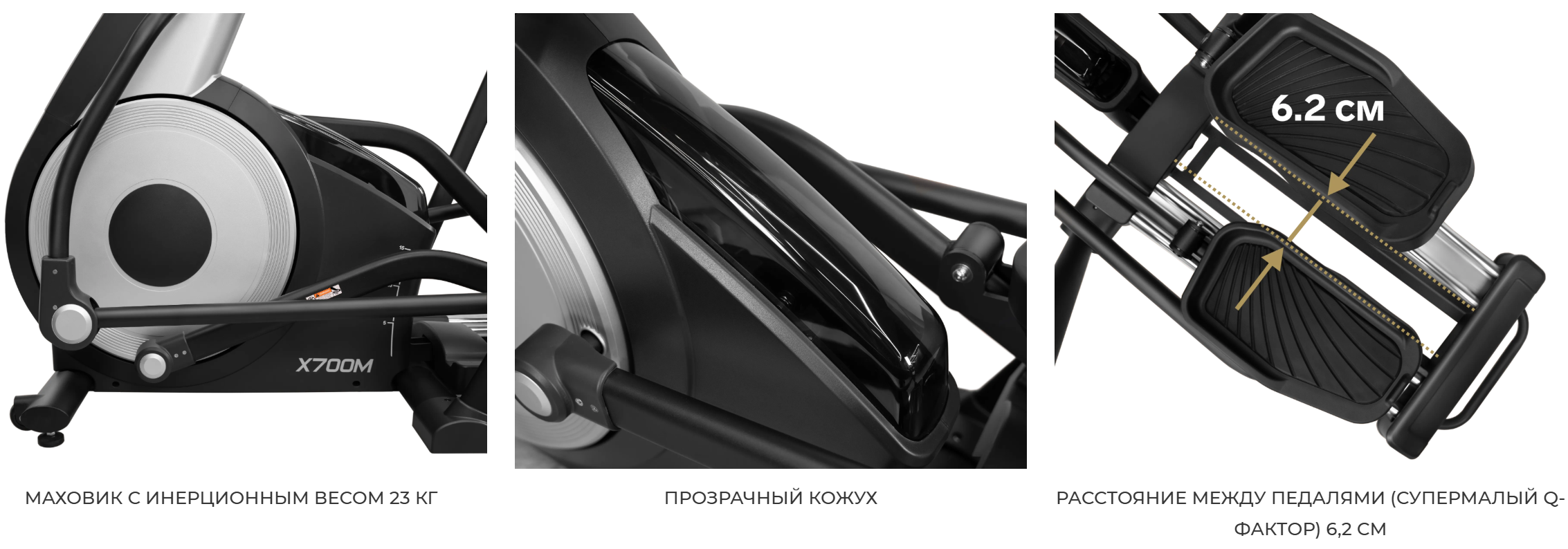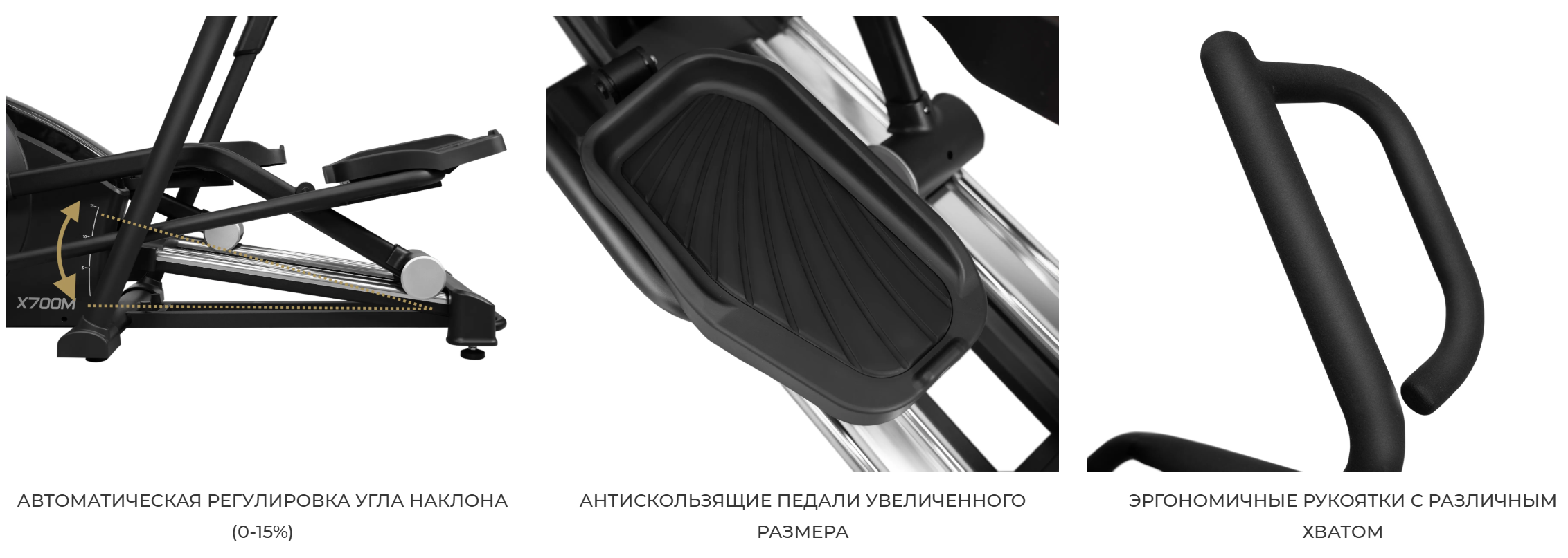 X700M обладает рядом преимуществ в биомеханических свойствах. Среди них магнитная приводная система высшего класса (PMS) и сбалансированный маховик с инерционным весом 23 кг. Расположенный спереди маховик позволяет значительно лучше настроить общую траекторию движения, уменьшить расстояние между педалями и проще добиться увеличения длины шага. У BRONZE GYM X700M супермалый Q-Фактор, длина шага равна 50,8 см. Мягкое педалирование и равномерное распределение нагрузки на всем цикле движения осуществляется за счет супернадежного дискового шатуна в педальном узле с использованием качественных подшипников. За плавное и тихое скольжение отвечают сдвоенные полиуретановые ролики коммерческого класса, которые передвигаются по усиленным парным направляющим. Последние обеспечивают как устойчивость тренажера, так и его надежность. Важной особенностью эллиптического эргометра является возможность изменять угол наклона. Для эллиптических тренажеров это довольно редкая опция. Угол наклона изменяется автоматическим путем до 15%, что позволит разнообразить тренировочный процесс и добавить интенсивности.
