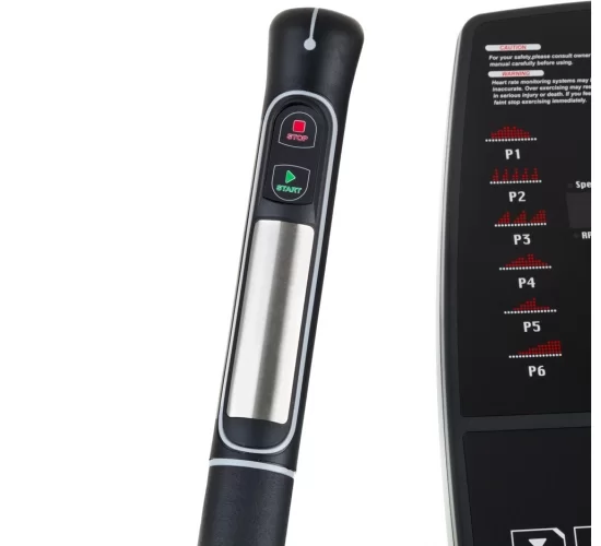 Цифры и буквы на консоле большие и поэтому легко читаются, дисплей удобен в использовании. Этот эллиптический тренажер также оснащен входом USB, который позволяет заряжать телефон, и динамиками, которые позволяют слушать музыку. Рамка дисплея оснащена держателем для планшета/телефона/журнала и двумя лотками, что обеспечивает высокий уровень комфорта.