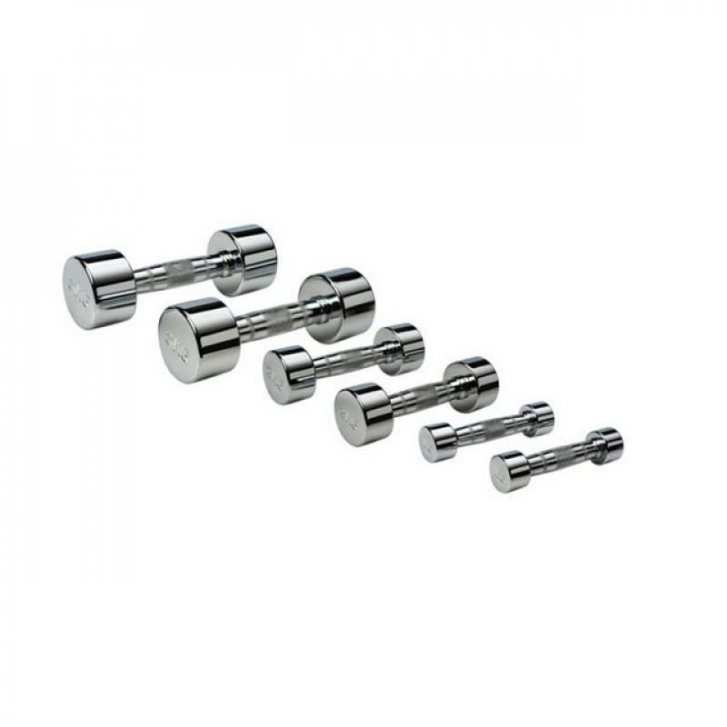 Гантельный ряд из парных гантелей стальных хромированных неразборных. Ручка с засечками для прочного хвата. На торцах гантели изображен логотип производителя и вес.