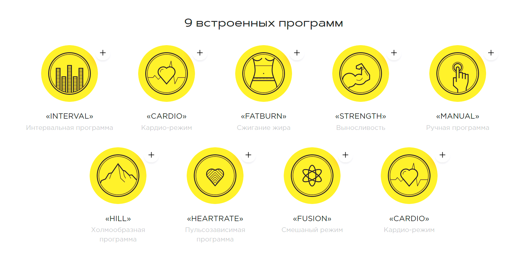 2 H.R, Hill, Fat Burn, Cardio, Strength, Interval, Custom, Fit Test and Manual