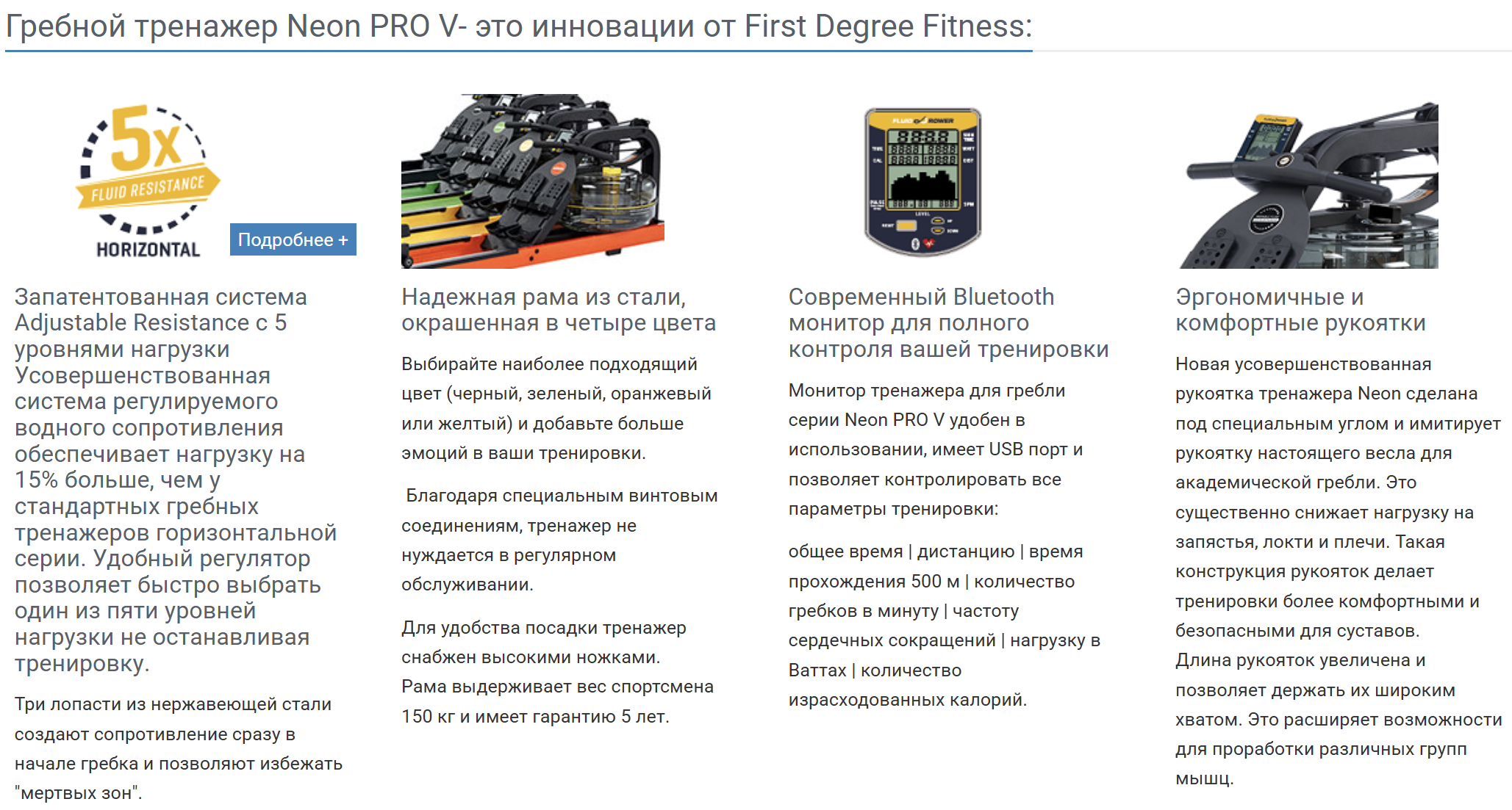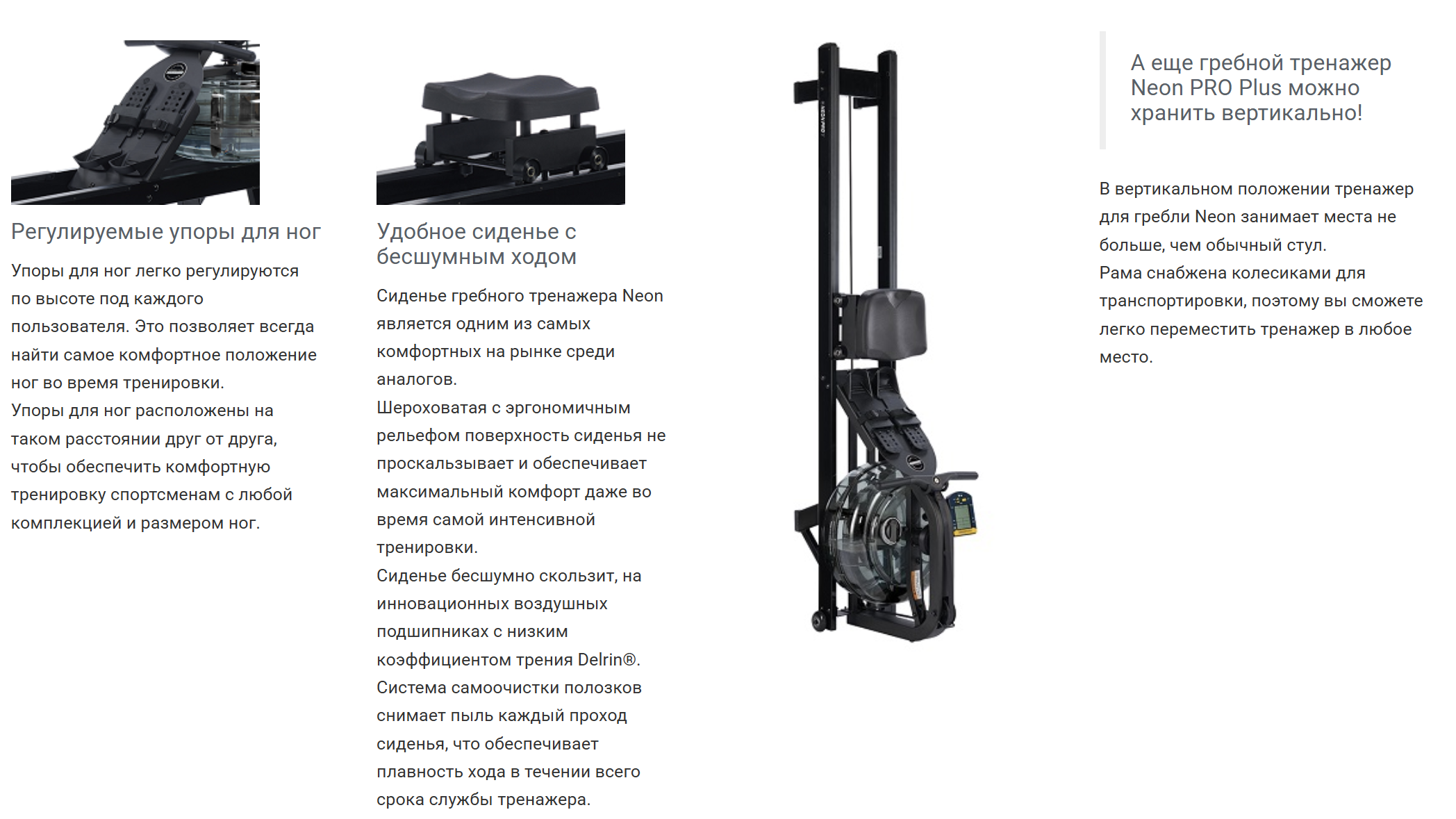 Мы тщательно проработали каждую деталь гребного тренажера Neon PRO V – более высокая и комфортная посадка пользователя, эргономичная рукоятка, снижающая нагрузку на суставы рук, система самоочистки полозков, обеспечивающая плавность хода в течении всего срока службы и многое другое.