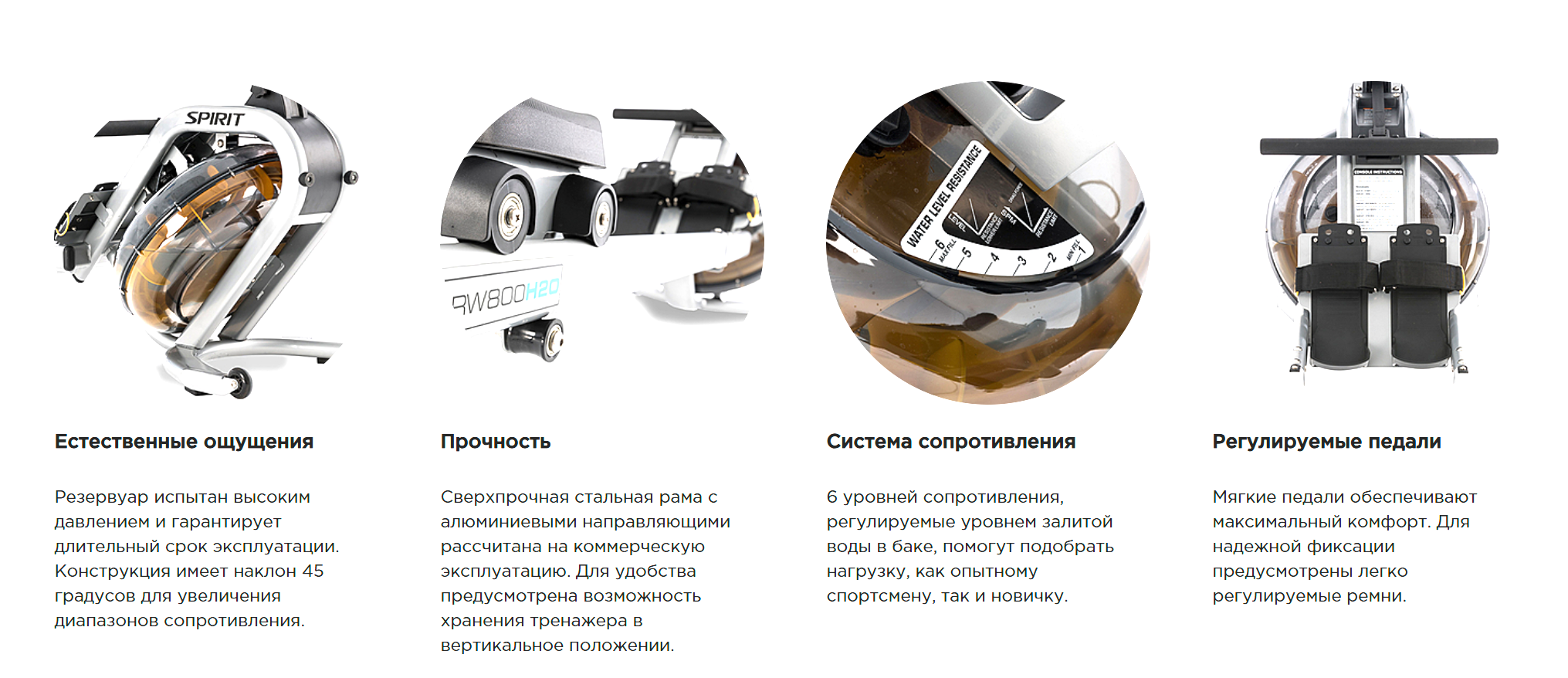 Резервуар для воды обеспечивает до 6 уровней сопротивления и расположен под углом 45 градусов. Большие мягкие педали, удобные эргономичные ручки и сиденье делают CRW800H2O одним из самых удобных и доступных коммерческих гребных тренажеров.