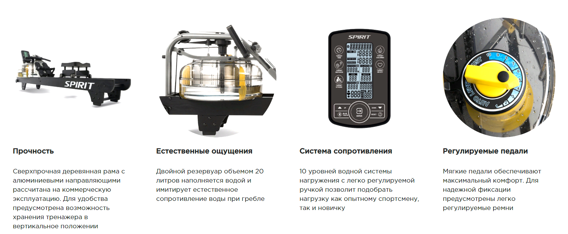 Двойной резервуар объемом 20 литров наполняется водой и имитирует естественное сопротивление воды при гребле.
