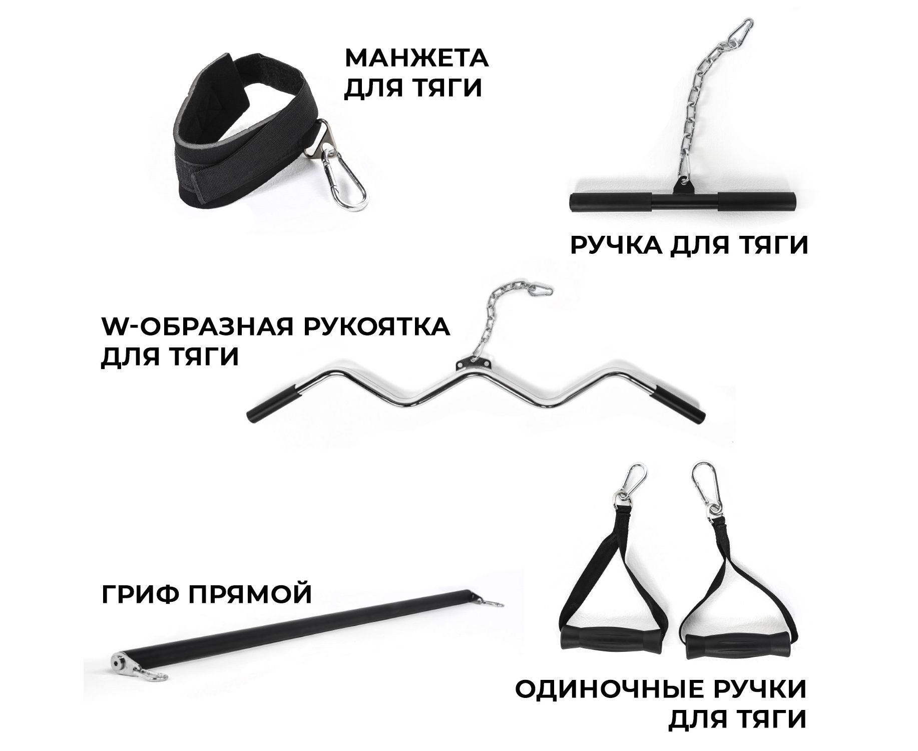 Большой выбор различных грифов и ручек для занятий на тренажере.