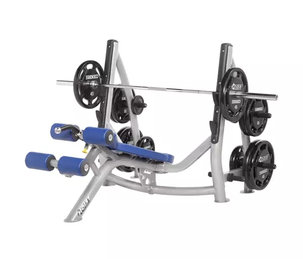 Олимпийская скамья с обратным наклоном CF-3177 оборудована восьмью держателями под диски. Максимальная нагрузка на тренажер составляет 405 кг. Спинка имеет угол наклона – 15 градусов. Вертикальные стойки имеют изогнутую форму, что позволяет естественным образом повторять траекторию движений при проведении упражнений.