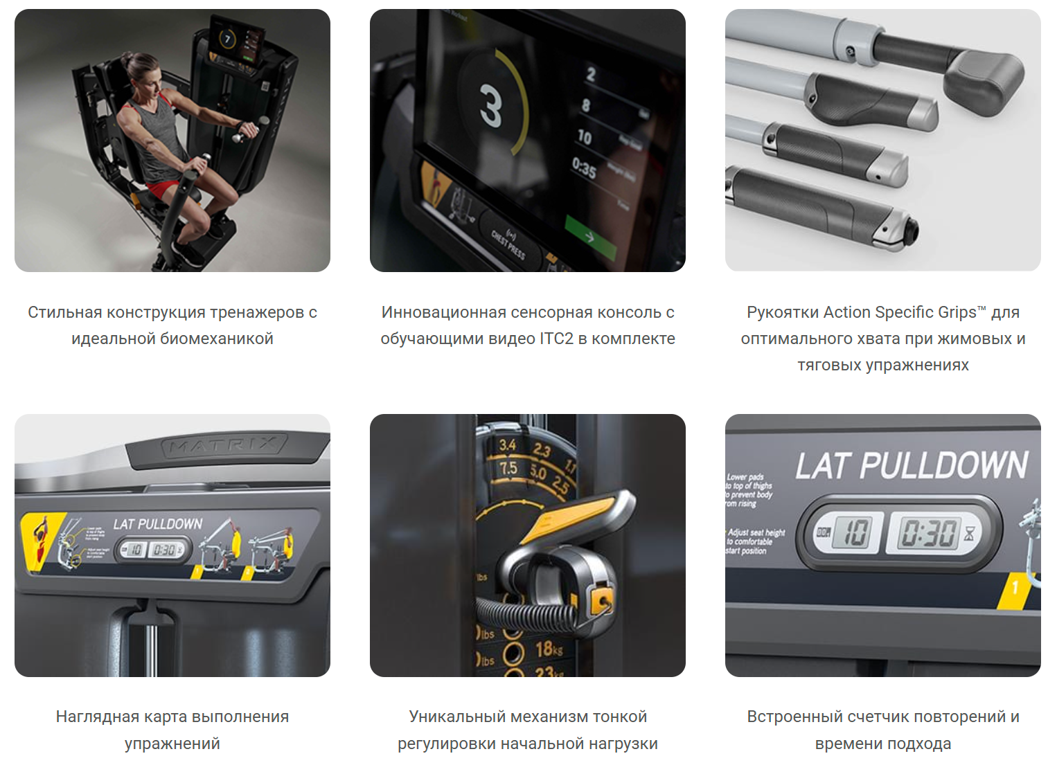 Задействуемые мышцы, растяжка в соответствии с особенностями упражнения, иллюстрация начального и конечного положения, правильные регулировки тренажера, цветовое обозначение компонентов тренажера