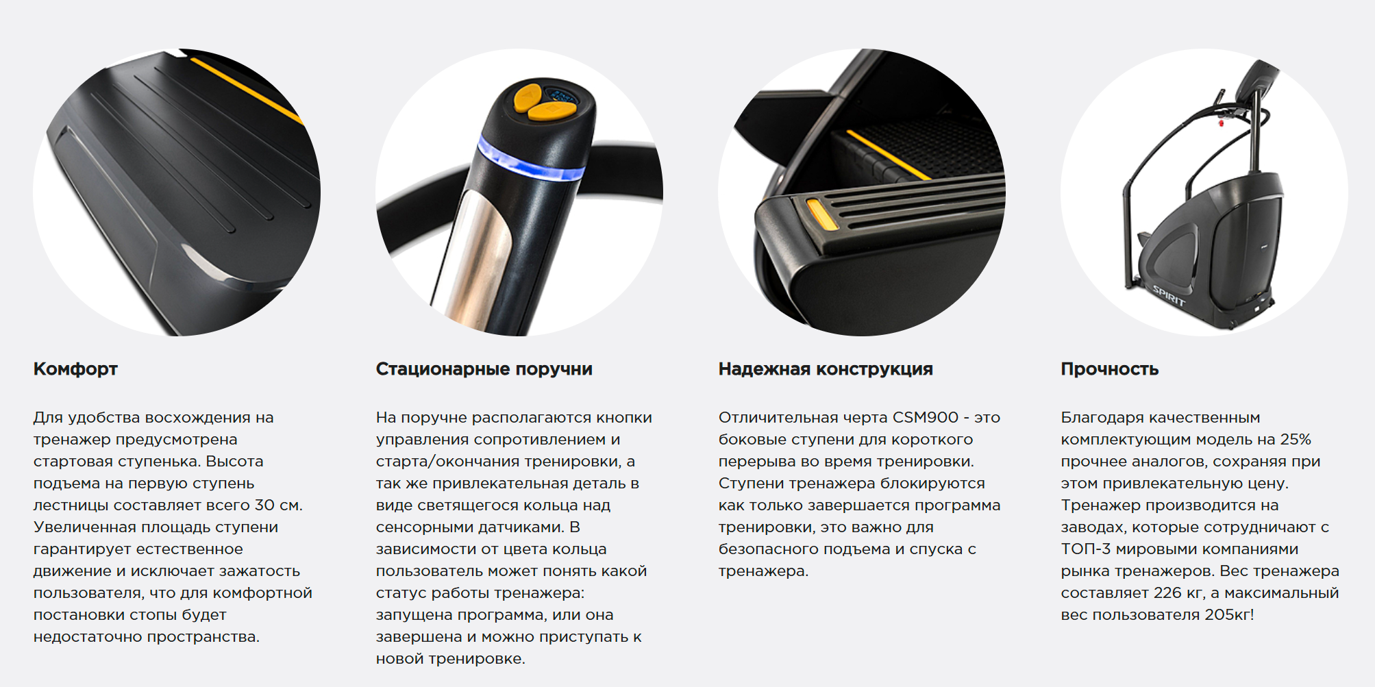 Дисплей консоли оснащен большим графическим LED дисплеем с приятным цветом свечения светодиодов. Сенсорные датчики измерения пульса обеспечивают контроль за пульсом и общей эффективностью Вашей тренировки. Параметры тренировки на лестнице CSM900 можно легко изменить во время тренировки. Поручни с мягким покрытием обеспечивают безопасность и комфорт на протяжении всей тренировки, делая удобным подъем и спуск с тренажера.