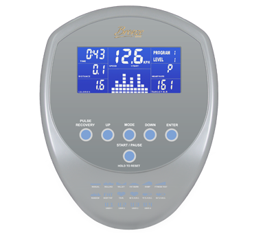 Система нагружения имеет 16 уровней и широкий диапазон. Консоль имеет голубой LCD экран, на который выводитмя профиль тренировки. В программном пакете имеются 4 профиля тренировки, случайная тренировка, 4 пользовательских профиля, фитнес-тест и 4 пульсозависимых режима (60%/75%/85%/THR). Жироанализатор Body Fat также имеет несколько режимов (телосложение BodyType, индекс массы тела BMI, индекс метаболизма BMR).
