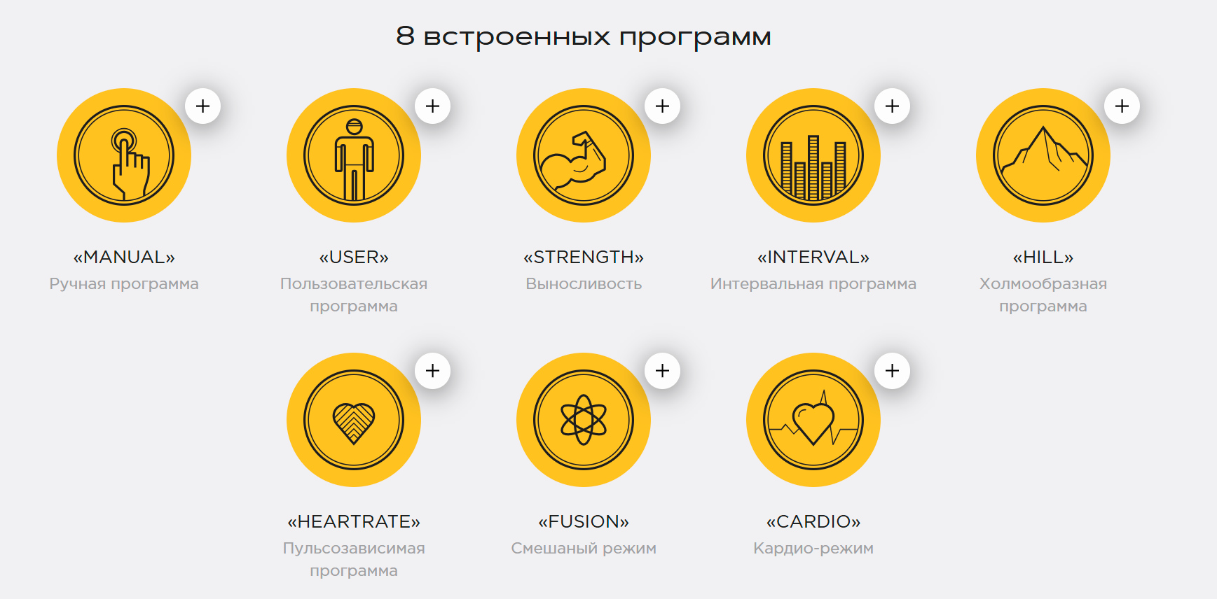 2 H.R, Hill, Fat Burn, Cardio, Strength, Interval, Custom, Fit Test and Manual