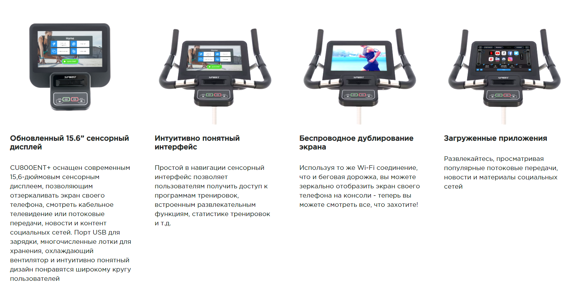 Велотренажер SPIRIT CU800ENT+ сочетает в себе качество и надежность конструкции CU800+ вместе с интерактивной составляющей — TFT-дисплей. Просмотр ТВ-передач, посещение интернет порталов и воспроизведение музыки внесут разнообразие в стандартную кардио тренировку. Консоль с сенсорным дисплеем диагональю 15,6 дюймов и интуитивно понятный дизайн созданы для того чтобы получать истинное удовольствие, не отвлекаясь на мелочи.