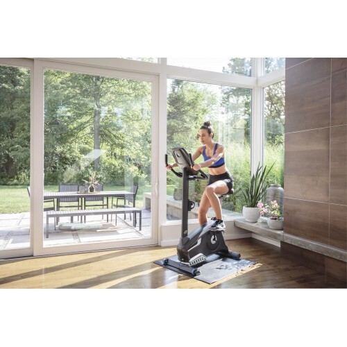 Доступно 25 уровней сопротивления, которое оказывается электромагнитной системой – можно заниматься как легком режиме, так и с интенсивной нагрузкой. Работа велотренажера основывается на высокоскоростной системе с высоким инерционным приводом и взвешенным по периметру маховиком, что обеспечивает плавное переключение уровней нагрузки. Консоль тренажера оснащена двойным жидкокристаллическим дисплеем, оборудованным подсветкой.