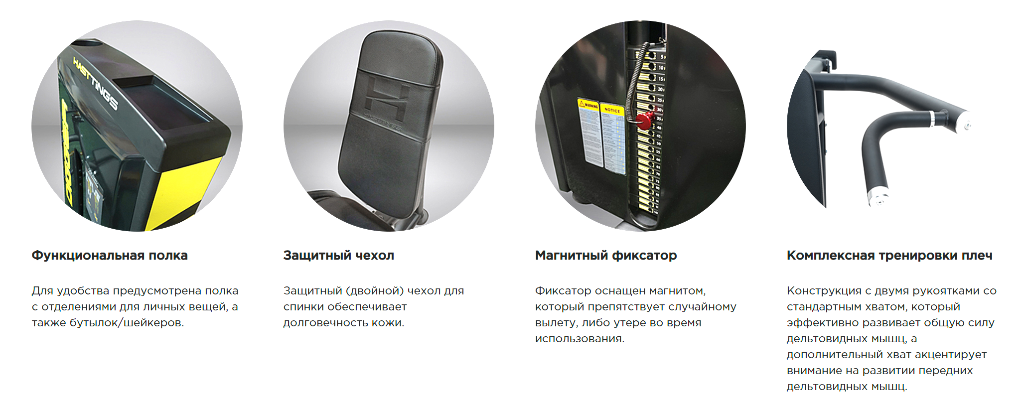 Конструктивные элементы рамы изготовлены из высококачественной стали, покрытых высокопрочной износостойкой двухслойной полимерной краской. Профессиональное силовое оборудование предназначено для проработки передних и средних дельт плеч, трапециевидных мышцы спины, трицепсов рук, верх грудных мышц.